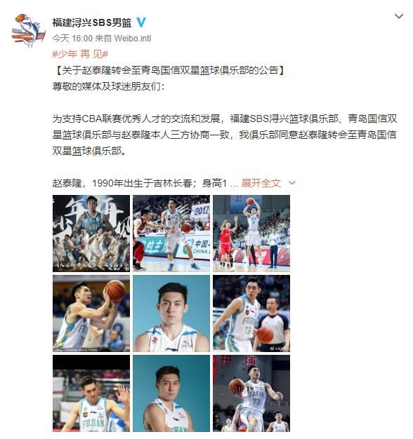 福建SBS浔兴篮球俱乐部在公告对赵泰隆表达了感谢:向13年老兵赵泰隆致以最诚挚的谢意,感谢曾经的并肩作战、风雨同行。同时,也希望他能在青岛国信双星篮球俱乐部继续取得更加辉煌的成绩。未来一切顺利,无论身在何处,福建永远是你的家!