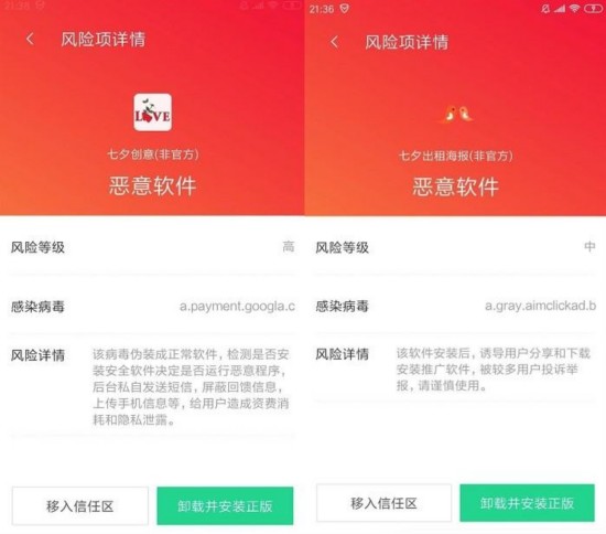 在大家沉浸在七夕情人节的美好时光时,一些不法分子却趁机在七夕相关软件中植入病毒,诱导用户下载并造成财产损失。目前,腾讯手机管家依托腾讯自研AI反病毒引擎TRP-AI和自研杀毒引擎TAV,已对“送给未来的她”、“七夕创意”、“七夕出租海报”、“七巧板魔盒”4款非官方应用软件实现了精准查杀。
