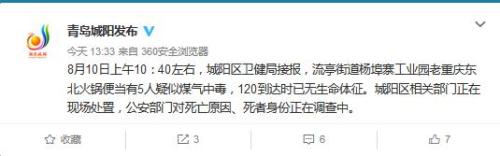 荔枝新闻讯 据青岛市城阳区人民政府新闻办微博消息,8月10日上午10时40分左右,青岛市城阳区卫健局接报,流亭街道杨埠寨工业园老重庆东北火锅便当有5人疑似煤气中毒,120到达时已无生命体征。