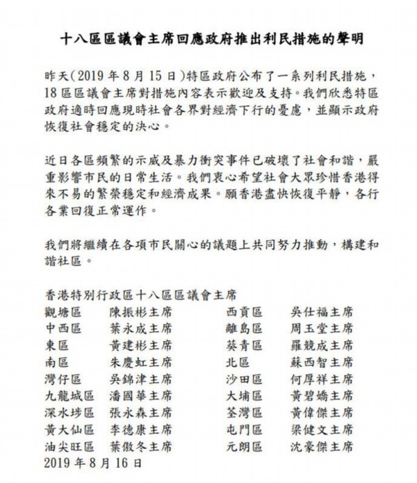 △十八区区议会主席联署支持特区政府推出利民措施