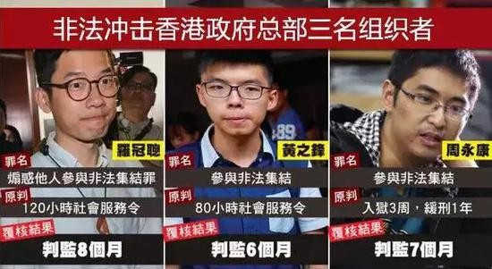 香港律政司认为这个刑罚过轻,因此提出刑期复核,改判黄之锋入狱半年、罗冠聪入狱8个月、周永康入狱7个月。