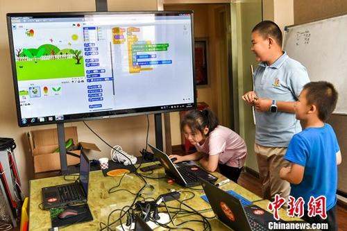 资料图:7月5日,新疆乌鲁木齐,一家培训机构的少儿编程班里,孩子们正在展示当天的编程作业。中新社记者 刘新 摄