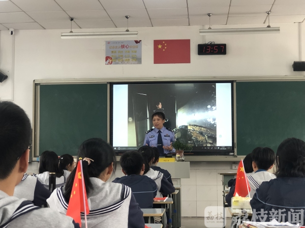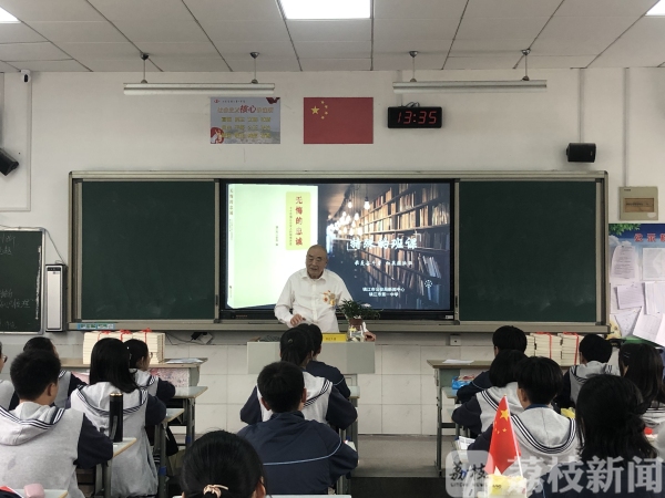 在镇江市第一中学高二(14)班的班课上,87岁的董宝森向学生们讲述了自己1949年加入镇江公安队伍后,成功破获私贩银圆大案的故事,赢得学生们阵阵掌声。随后,镇江市公安局京口分局刑事科学技术室主任金怡讲述了自己第一次勘查凶案现场时如何克服内心恐惧,而京口分局网络安全保卫大队大队长夏忠则分享了打击淫秽网站的故事。老中青三代镇江公安人的讲述,让学生们深有感触。高二学生何霈雯:“作为青少年,我们就是应该有梦想,然后能够脚踏实地的去一步步去实现它。”