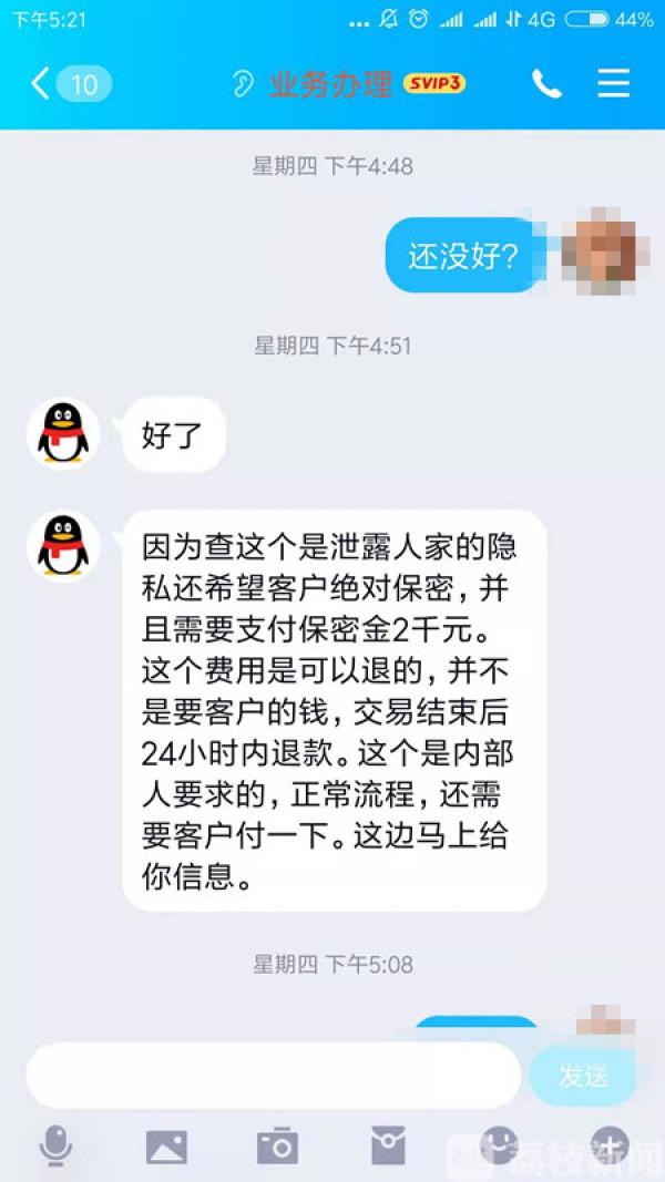 赵女士按照对方要求,通过支付宝口令的方式转了800元查询费。第二天,在约定的时间,却没有等到对方发来的查询信息。对方表示,为防止查到的信息被泄露,赵女士还要付2000元的保证金,24小时内不泄露信息,这个保证金就可以退回。
