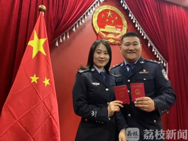 “今天就官宣了啊!”“祝你们幸福!”上午11时许,大队教导员顾建建得知两人刚领完结婚证,随即从单位给王达飞打来了视频电话。视频的那头,战友们欢笑着用这种特殊的方式给他俩送上最好的祝福。