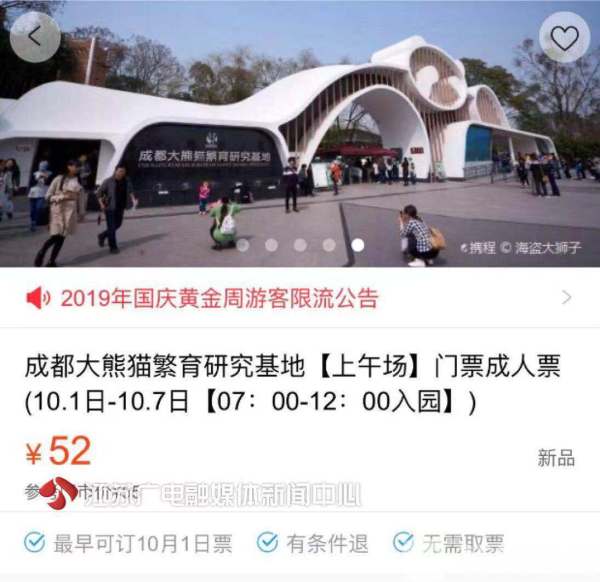 在预约和限流的大环境下,9月下旬以来,在国庆假期的一周前时间,某大型旅游APP门票产品开始进入预订高峰。如近日公布取消线下售票的“成都大熊猫繁育研究基地”,游客现在已经可以预约国庆期间的门票,单日限量60000张,全部需要在网络平台上进行预约。
