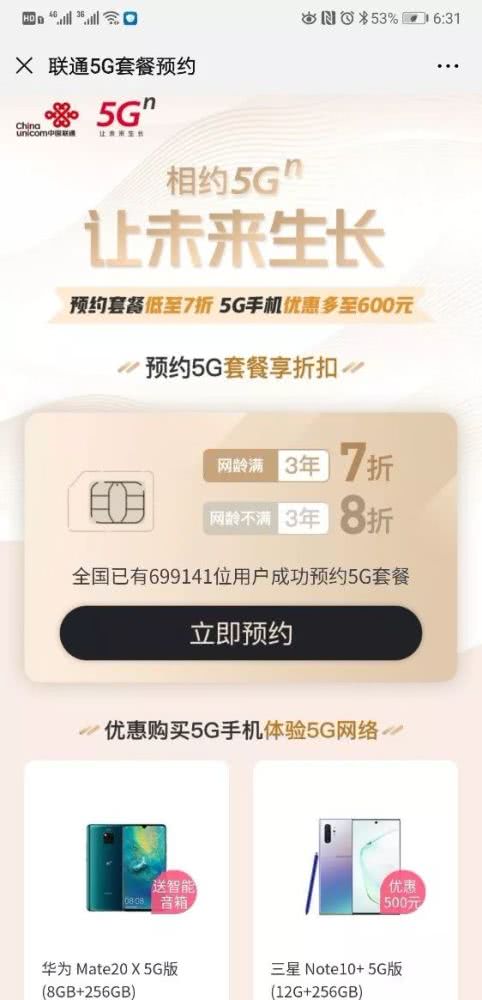 中国联通官方表示,即日起至5G套餐正式上市前,预约中国联通5G套餐可享折扣优惠,网龄3年及以上用户享七折优惠,网龄3年以内及新入网用户享八折优惠。购买5G手机也会有600以内的优惠幅度,5G终端用户还可以免费领5G体验包,包括100GB流量。