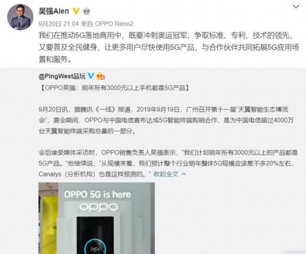 OPPO也没有发布5G新机。OPPO副总裁吴强近日在微博上委婉回应了一下公众疑虑。他说,在推动5G落地商用中,既要冲刺奥运冠军,又要普及全民健身。OPPO计划明年所有3000元以上产品都是5G产品。