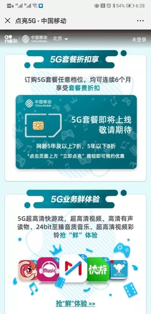 中国移动官方表示,中国移动全国统一5G套餐暂未上线,上线后将通过短信告知已预约用户。预约5G的用户自领取5G套餐折扣优惠之日起三个月内如订购中国移动全网统一套餐,则订购后可连续6个月享受套餐费折扣。网龄越长优惠越多,网龄5年及以上享七折优惠,网龄5年以内享八折优惠。