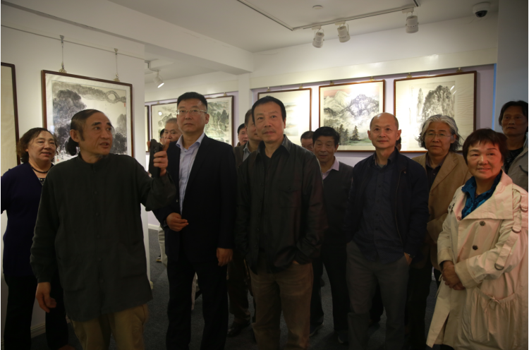 18日下午江苏省文德中国山水画研究会张兴来会长,副会长徐建明,毕宝祥,郑伟建,王国斌,张小冬以及江苏省艺术研究院古强院长,南京市美协刘红沛副主席,南京市对外文化交流中心苏涛副理事长,周向东调研员等观看了画展,以及全省各地赶来的会员也观展并进行了书画交流。