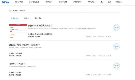 记者在黑猫投诉、聚投诉等第三方平台看到,有关猫眼电影“拉新活动不返现”的投诉比比皆是,仅10月份相关投诉案例就多达30件以上。