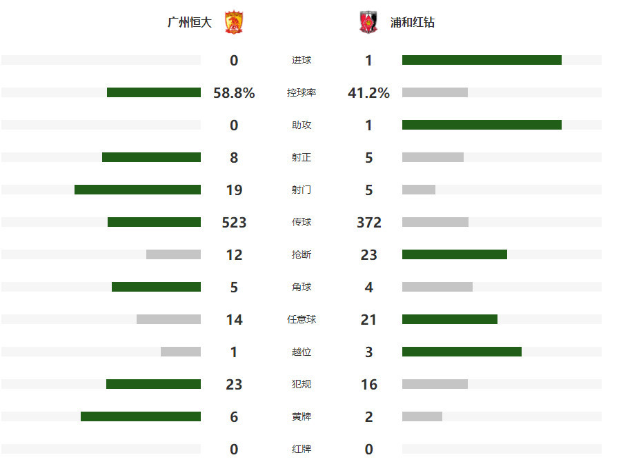 恒大在攻势上碾压对手,射门以19-5领先,射正以8-5占优,控球率则是以58.8%-41.2%优势明显。但恒大在优势如此之大的情况下,却仍然遭天体以0-1不敌浦和,遭对手双杀出局。