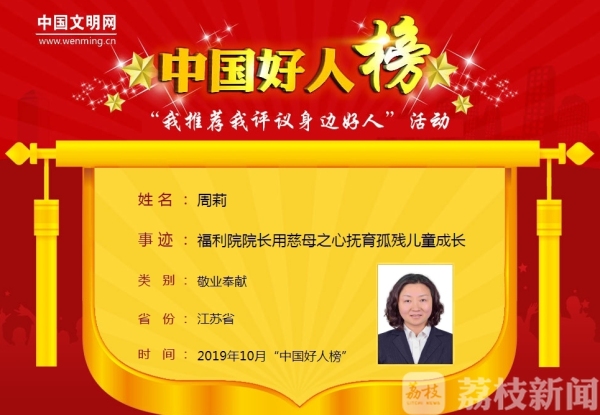 10月30日,中央文明办十月中国好人榜榜单发布,宿迁市宿城区社会福利院院长周莉光荣当选敬业奉献好人。