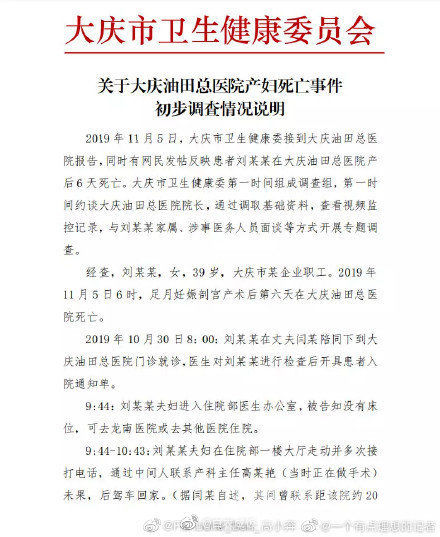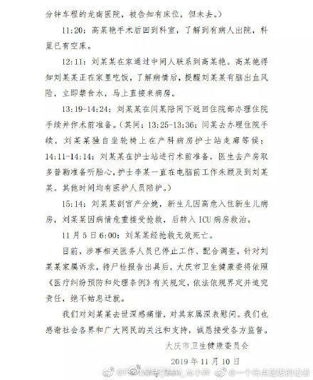 11月9日,大庆卫健委就此事发布调查情况说明。说明称,由于没有床位,院方曾劝说产妇去其他医院。同时公布事件发生时间线,称产妇危重情况下仍回家吃饭。