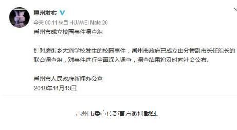 荔枝新闻讯 据河南省禹州市委宣传部11月14日凌晨通报,针对磨街乡大涧学校发生的校园事件,禹州市政府已成立由分管副市长任组长的联合调查组,对事件进行全面深入调查,结果将及时向社会公布。详情>>