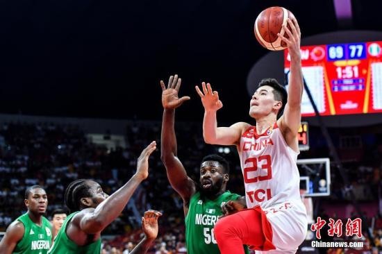 资料图:中国队球员阿不都沙拉木(右一)在比赛中上篮。中新社记者 陈骥旻 摄