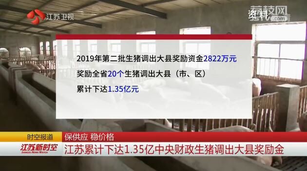 为保障生猪供应,稳定猪肉价格,江苏近日下达今年第二批中央财政生猪调出大县奖励资金,两批累计下达1.35亿。
