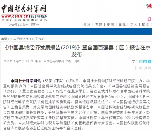 12月6日,“中国社会科学院财经战略研究院成果发布会:《中国县域经济发展报告(2019)》暨全国百强县(区)报告”在北京举行。《中国县域经济发展报告(2019)》由中国社会科学院财经战略研究院县域经济课题组组长吕风勇主编,中国社会科学院财经战略研究院与《华夏时报》共同发布。