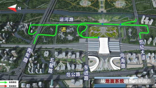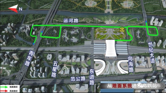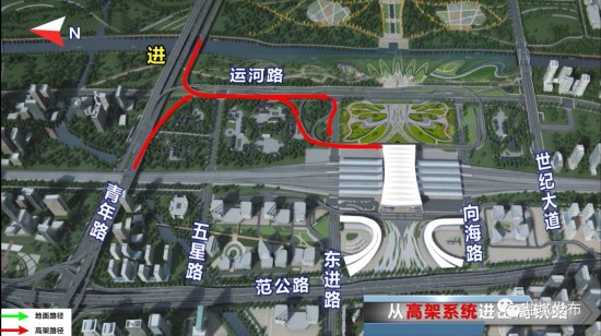 进站:青年路高架→匝道→东广场高架落客平台;青年路高架→匝道→运河路。