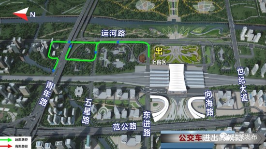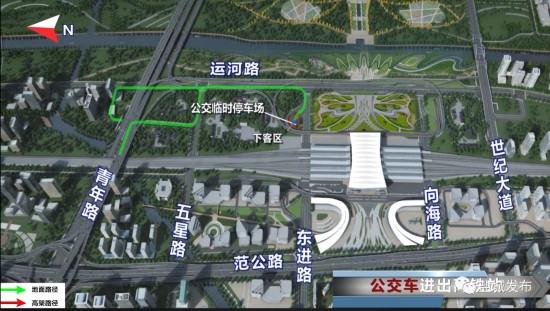 进站:青年路(向东)→匝道→五星路→运河路→公交临时停车场;青年路(向西)→匝道→运河路→公交临时停车场。
