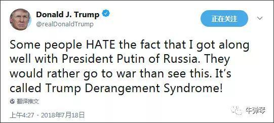 他还为自己辩护:有些人讨厌我和俄罗斯总统普京相处得很好。他们宁愿去打仗也不愿看到这一切。这叫做特朗普精神错乱综合症!