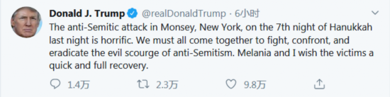 “在光明节的第7个晚上,纽约州蒙西镇发生了反犹袭击案,这是非常可怕的。我们必须团结起来,以打击、对抗并铲除反犹太主义的邪恶祸害。梅拉尼娅和我祝愿受害者早日痊愈。”特朗普在推特上写道。