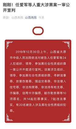 荔枝新闻讯 山西高院微信号消息,2019年12月30日上午,山西省太原市中级人民法院依法对被告人任爱军等24人犯组织、领导、参加黑社会性质组织罪一案公开开庭进行宣判。该案涉及组织、领导、参加黑社会性质组织罪,寻衅滋事罪,故意伤害罪,强迫交易罪,非法侵入住宅罪,非法拘禁罪,非法持有枪支罪,诈骗罪,信用卡诈骗罪,敲诈勒索罪等10项罪名,共14起犯罪事实、7起违法事实,有20名被告人涉及黑社会性质组织犯罪。