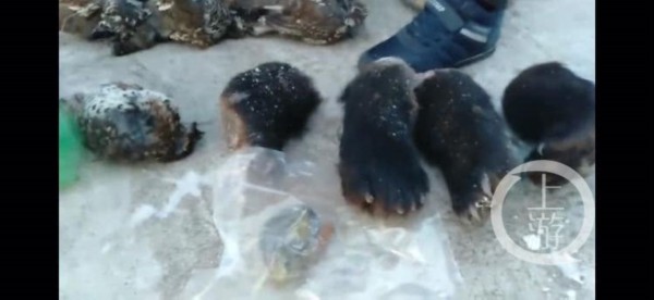 12月29日,公益组织“反盗猎重案组”发布消息称,日前,黑龙江执法部门接志愿者举报,打掉了一个非法贩卖野生动物的山货店,查获的野生动物有熊掌、熊胆、花尾榛鸡、猫头鹰、狍子等,而部分野生动物的存放地点是哈尔滨市通河县凤山镇政府食堂和车库中。