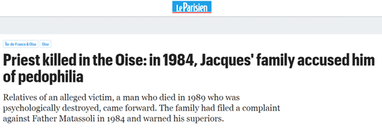 法国《巴黎人报》就介绍说,那名自杀的受害者名叫Jacques,曾于6到14岁之间遭到过神父Matassoli的性侵,之后就整个人就一直处在精神恍惚的状态,直到1989年他27岁时投河自尽。