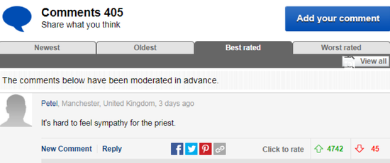最后,在这番案情被曝光后,许多关注此案的西方网民都认为这名神父被杀“活该”。在英国《每日邮报》的报道评论区,获得4000多条点赞的一条评论就写到:“很难同情这名(被杀的)神父”。