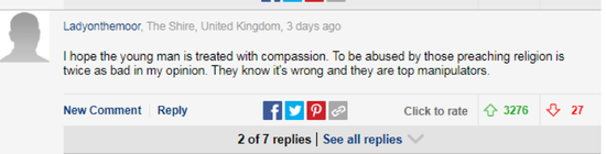 一条3000多条点赞的评论写到:“我希望那个年轻人可以得到同情。在我看来,被传教的人性侵,这种伤害是加倍的。他们明知这是错的,却仍然玩弄人心”。