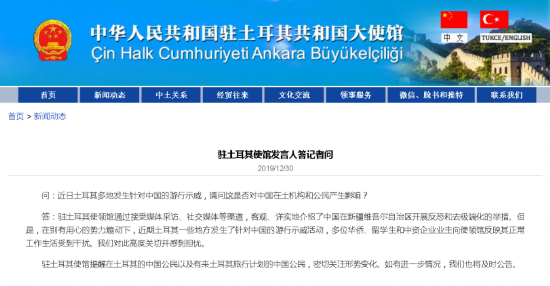 中华人民共和国驻土耳其共和国大使馆官方网站30日发布“驻土耳其使馆发言人答记者问”,内容如下: