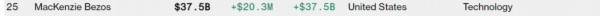 而他的前妻也凭借市值375亿的亚马逊股份,进入了榜单,位列第25名。