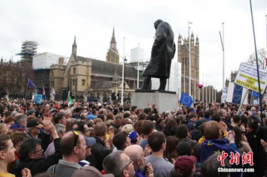 资料图:2019年3月,英国伦敦市中心举行大规模呼吁举行“第二次脱欧公投”的游行。