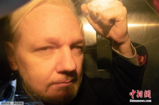 资料图:2019年5月1日,“维基揭秘”网站创始人阿桑奇在英国被判入狱50周,罪名是他7年前违反保释条例进入厄瓜多尔驻英使馆寻求庇护。