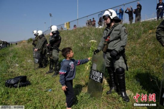 资料图:2019年4月4日,希腊北部城市迪亚瓦塔的郊外,防暴警察在难民搭建的营地旁站岗,一名来自难民家庭的小孩向他送去一束鲜花。