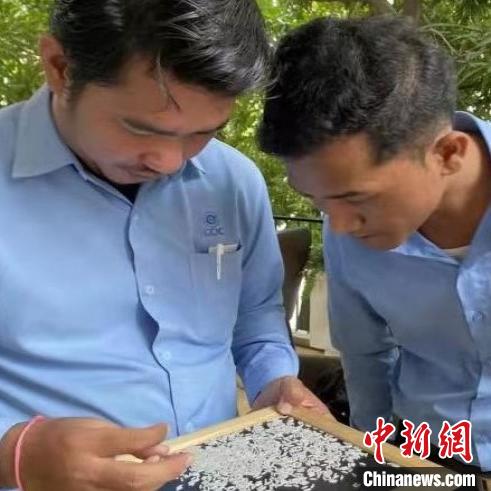图为CCIC柬埔寨公司检验员在户外仔细检验大米。 公司供图