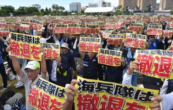 资料图片:日本民众举行示威要求驻日美海军陆战队撤离。(日本《东京新闻》网站)