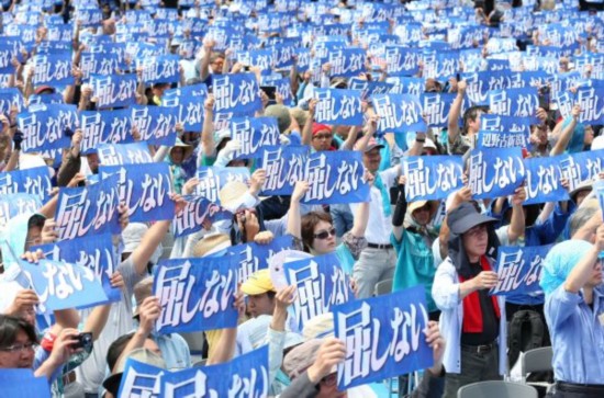 资料图:2015年5月17日,约3.5万名日本民众在冲绳县那霸市举行冲绳县民大会,要求立即关闭驻日美军普天间基地和停止在边野古地区新建军事基地。新华社记者刘天摄