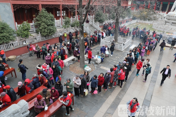 毗卢寺内,装满热气腾腾腊八粥的大桶,两边都排起了蜿蜒数百米等待打粥的市民。不少市民携家带口来到南京毗卢寺,一派其乐融融喜迎新年的温馨景象。
