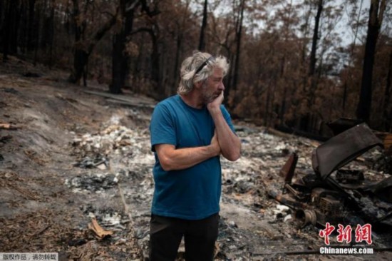 当地时间1月16日,澳大利亚冲浪者大卫·福特站在一片废墟旁满脸愁容。