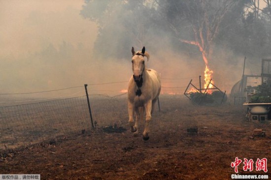 澳大利亚新南威尔士州诺瓦镇附近,丛林大火来临时,一匹马试图逃离住宅。