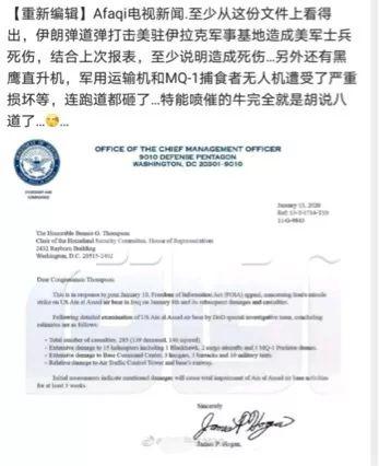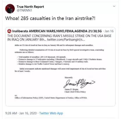 因为该网贴不仅宣称伊朗在1月8日对美军驻伊拉克基地的报复性恐袭中,实际上炸死炸伤了285名美军士兵,还拿出了一份美国国防部写给一名美国国会议员的信件作为佐证。