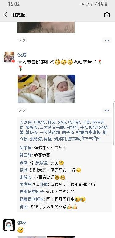 2月15日上午10时43分,警勤中队通信班副班长谈威的朋友圈,发了一条信息:“情人节最好的礼物,媳妇辛苦了!”很快,评论区就炸开了锅,“哦,原来是谈威当爸爸了”“谢谢大家,母子平安,6斤”,看着视频里的“四脚吞金兽”谈威笑得合不拢嘴。