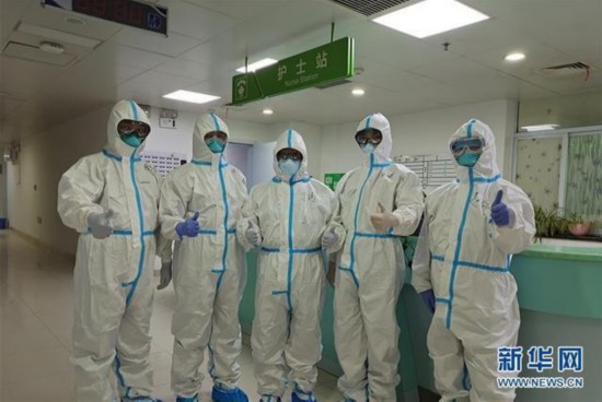 毛青(左二)和同事在金银潭医院一线病房工作时合影(1月26日摄)。 新华社发