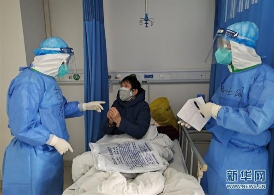 解放军感染病防控专家毛青(左)进入金银潭医院红区病房查房(1月31日摄)。 新华社发(高涛 摄)