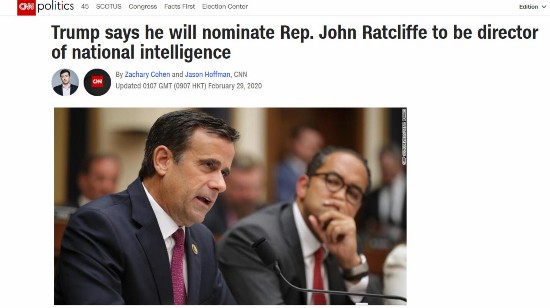 2019年7月底,特朗普宣布时任美国国家情报总监丹·科茨将离任,并拟提名约翰·拉特克利夫接任。8月,特朗普宣布放弃提名拉特克利夫出任国家情报总监,称其正遭到媒体的不公平对待,他本人决定留在国会,以避免在未来几个月经受“诽谤和中伤”。拉特克利夫也发表声明说,不希望看到他任职资质问题被政治化和党派化,因此请求特朗普提名他人出任国家情报总监。