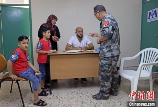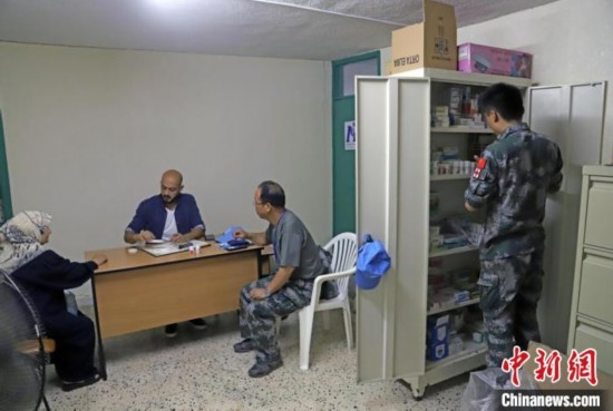 图为中国维和军医在黎巴嫩任务区巡诊医疗点为当地民众免费接诊并赠送药品。 孙帅 摄