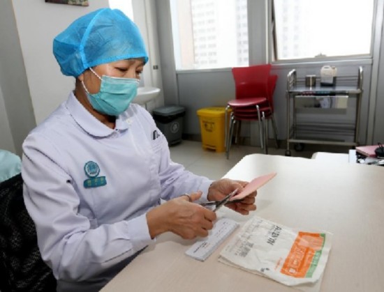 蒋琪霞护士长正在裁剪完善敷贴