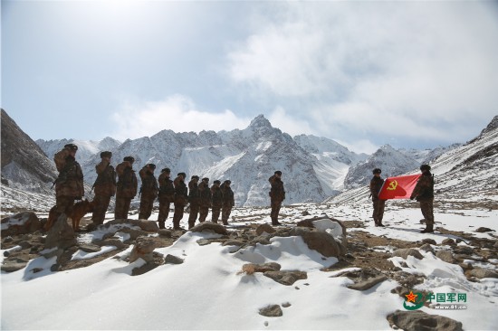 在雪山之巅,巡逻官兵向党旗宣誓。